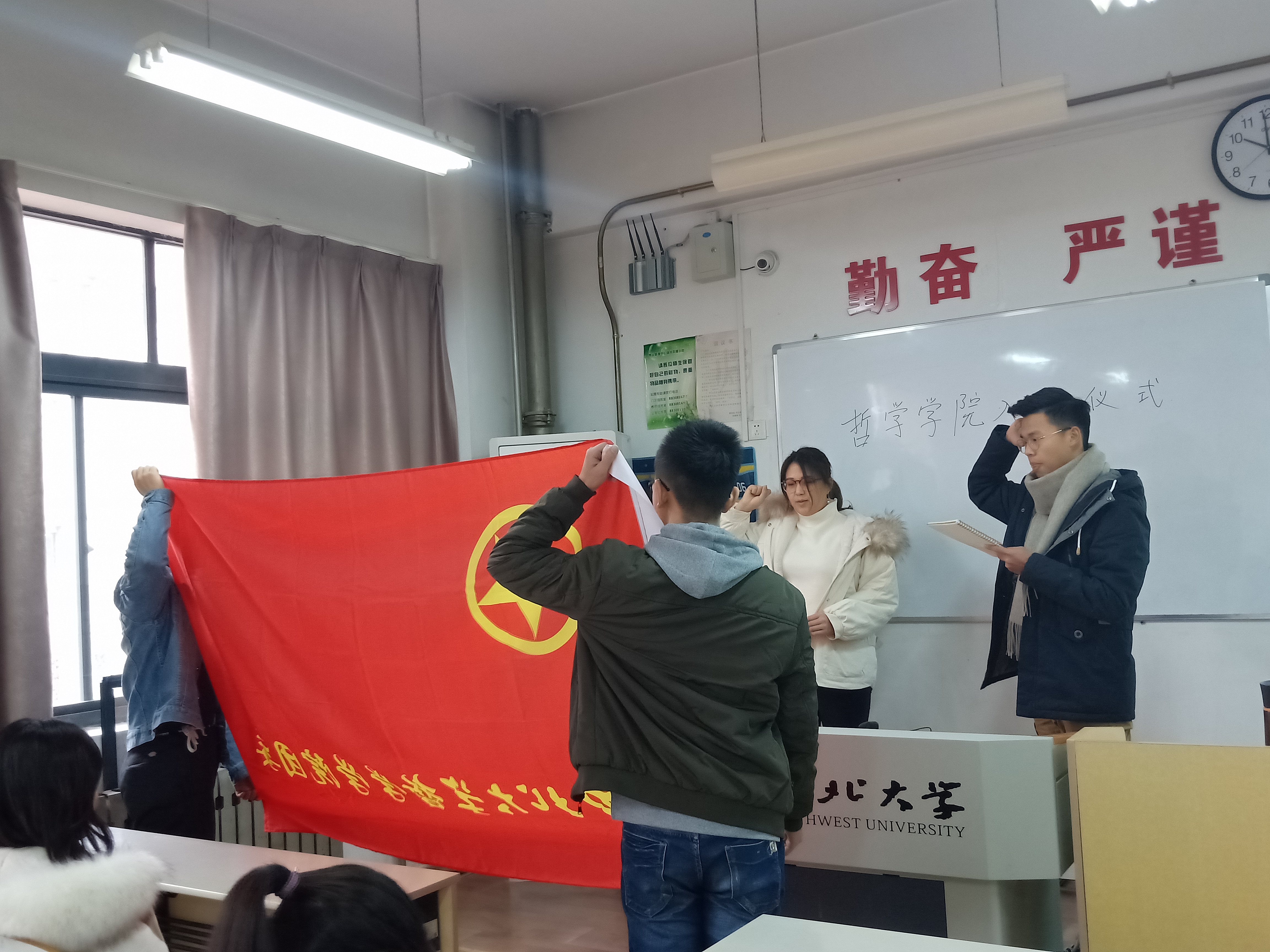 两位新团员在团旗下庄严宣誓:“我志愿加入中国共产主义青年团, 坚决拥护中国共产党的领导, 遵守团的章程,执行团的决议, 履行团员义务,严守团的纪律, 勤奋学习,积极工作,吃苦在前,享受在后, 为共产主义事业而奋斗!”