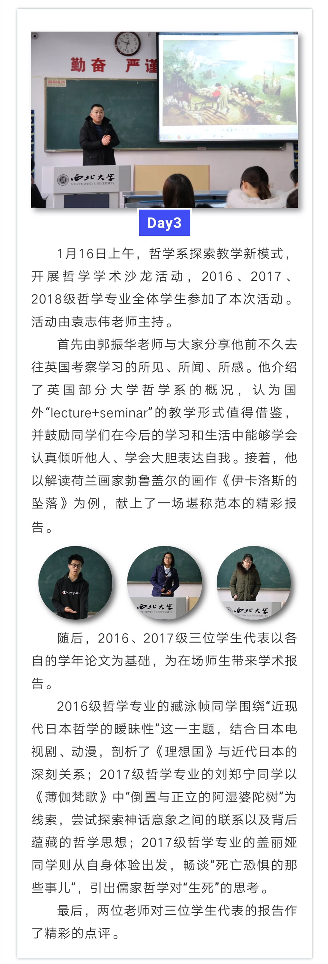 哲学系2018-2019学年第一学期实践教学周活动圆满结束。在这一周里,大家将理论和实践、学习和思考相结合,对哲学专业有了更深的理解和感悟。最后要感谢公司对实践教学活动一贯以来的支持,感谢所有老师们的辛勤付出,感谢各位同学的热情参与!