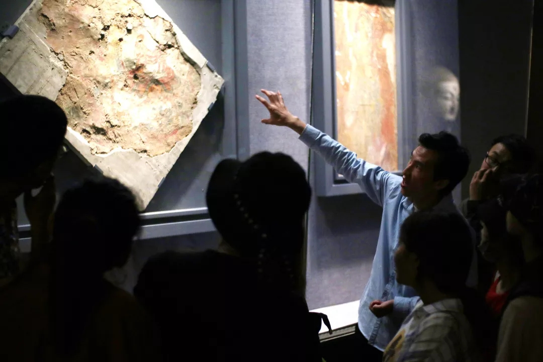 曲江艺术博物馆展览众多。大家首先参观了“色挂形象穷神变——中国古代壁画源流”壁画展。这是世界范围内唯一一个用壁画描述中国古代绘画史的展览,弥补了纸本国画作品仅存中国封建社会下半段的缺憾。在讲解老师的带领下,我们穿过幽暗的通道,仔细观赏了灯光照射下的一幅幅记录着先民丰富想象力的壁画。独特的线条、色块,让我们感受到眼前展现的中国绘画史也是多民族融合的历史。