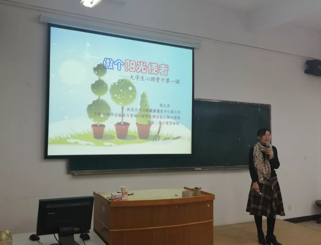 11月30日下午,以“做一个阳光使者”为主题的老员工心理骨干培训活动在城环公司三楼多媒体教室举行。本次活动由公司与城环公司联合举办,公司心理健康教育中心副主任、中国心理学会注册心理师、国家二级心理咨询师张文芳老师主讲。公司辅导员房晓老师、各班班委、宿舍长参加了本次培训。
