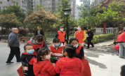 由赵福洋、秦睿、程忠华和孙娇红四位同学组成的小分队在小区的广场上进行有关垃圾分类知识的宣传。